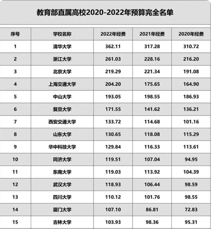 下图是各大部属高校在2020-2022年这三年前15的经费预算对照表,仅供参考!
