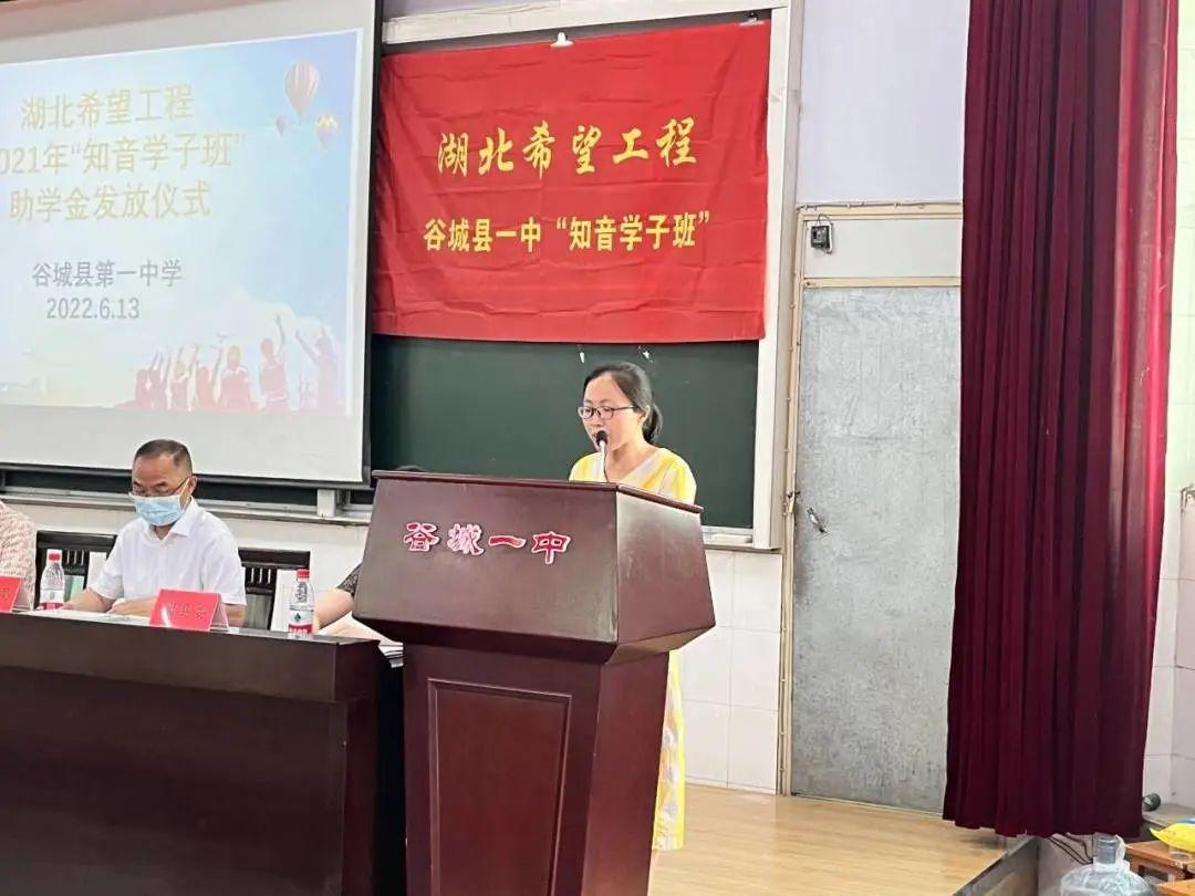 发放仪式上,谷城县第一中学党委委员,副校长胡玉霞介绍活动申报以及开展情况,并宣读受助学生名单、介绍受助学生整体学习情况。