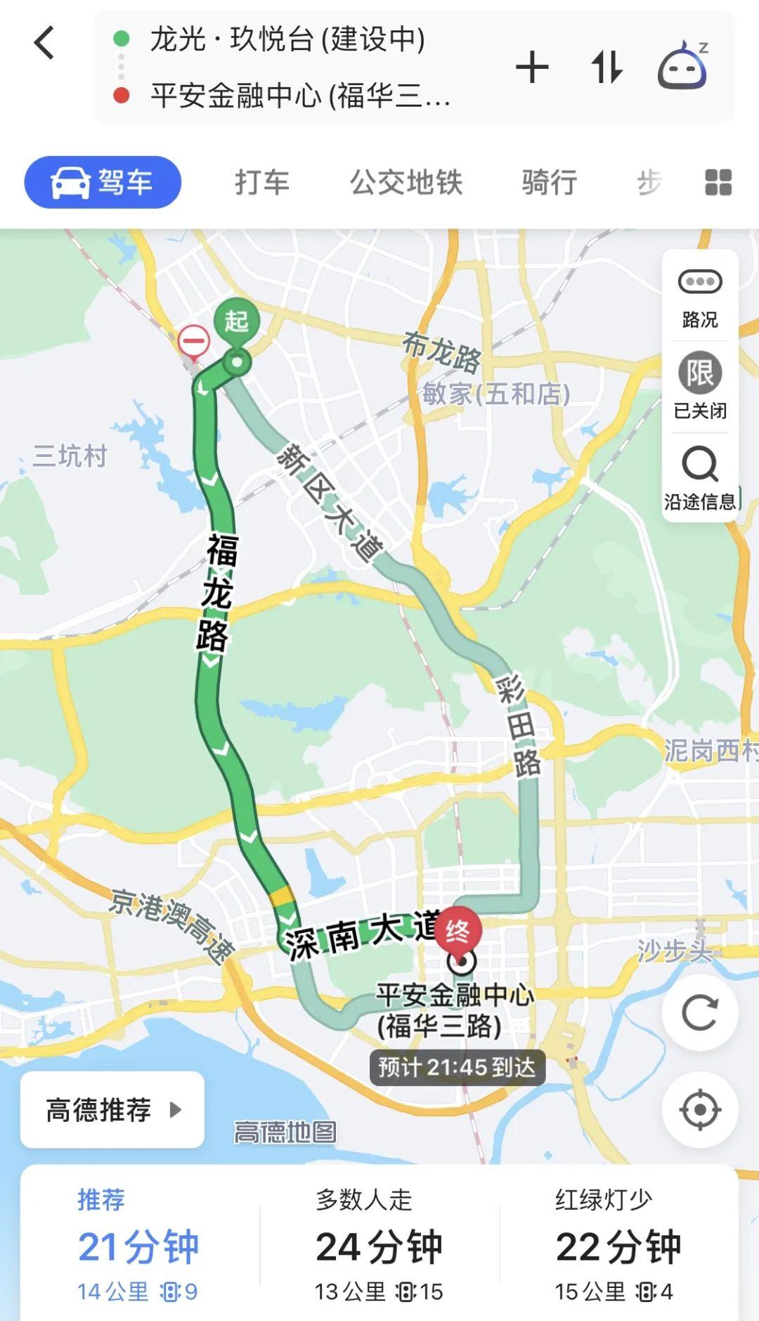 道路交通,龙华路网四通八达。从玖悦台出发,到平安金融中心,不堵车的话,开车只用20分钟左右。