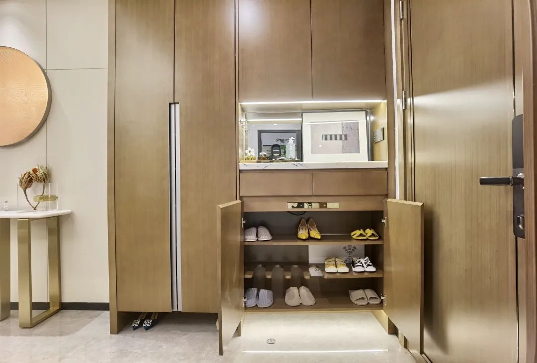 内置鞋柜-杀菌除臭烘干机、底部悬空、暗藏灯带、可移动展板、抽屉增加分割等5大魔鬼细节,一家人四季的鞋子、男主人的球具、女主人的包包、小主人的玩具,都收拾得妥妥帖帖。