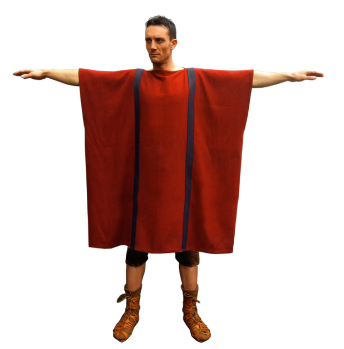 丘尼克就是由两块方形的羊毛布料组成,在肩头部位连接,随着身体下垂到膝盖部位,有条件的贵族还会在外面再佩戴一个披风。