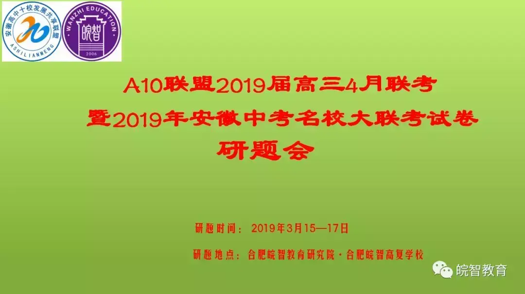 3月15~17日,由合肥皖智教育研究院主办的“1号卷·A10联盟2019届高三下学期四月联考”暨“安徽第一卷·2019年中考安徽名校大联考”研题会在合肥皖智教育研究院莲花科创园办公区以及合肥皖智高复学校会议室顺利举行。