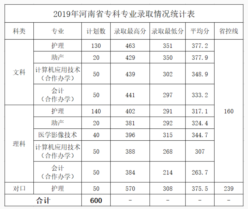 2019年我校在河南省投放普通专科计划723人,实际录取681人,其中普通专科文科共计录取考生234人,最高分494分,最低分388分;普通专科理科考生412人,最高分407分,最低分143分。其中男生214人,女生467人,回族考生7人,中共预备党员1人。