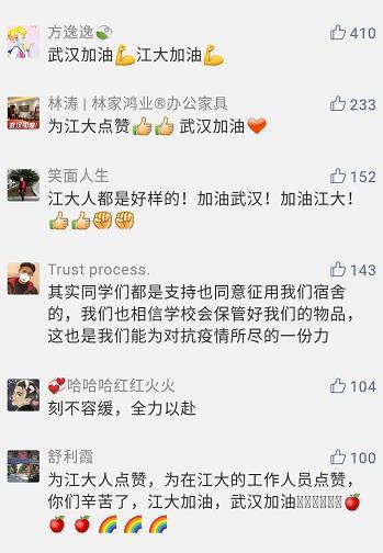 对于学校对宿舍的征用,在校的大学生们也给予了莫大的理解和支持,同学们纷纷为母校点赞,为武汉加油,为母校加油。
