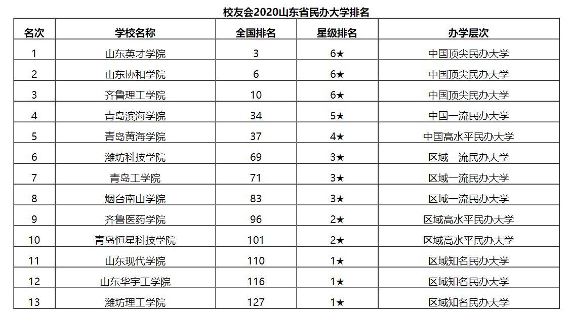 据中国校友会网(艾瑞深中国校友会网 )发布的2020中国大学排行榜中,民办大学排行榜中,山东省共有13所民办大学进入排名!