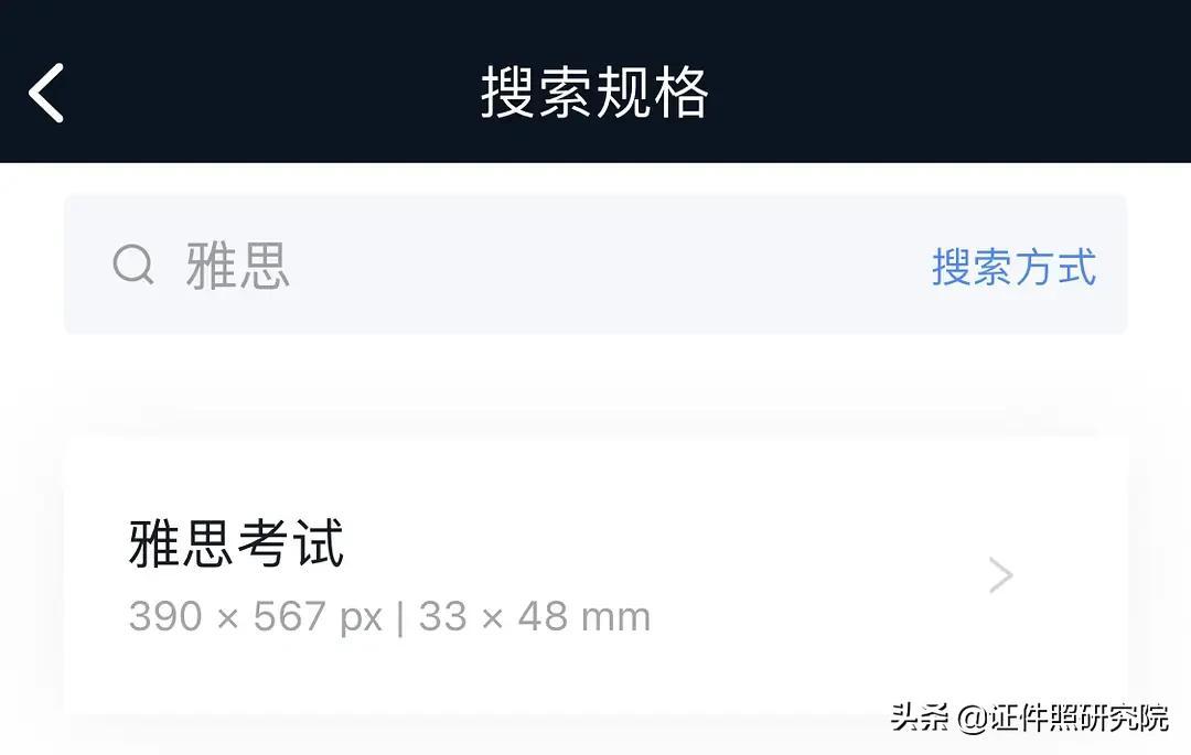 第一步:证件照研究院首页搜索框输入'雅思'搜索报名照规格