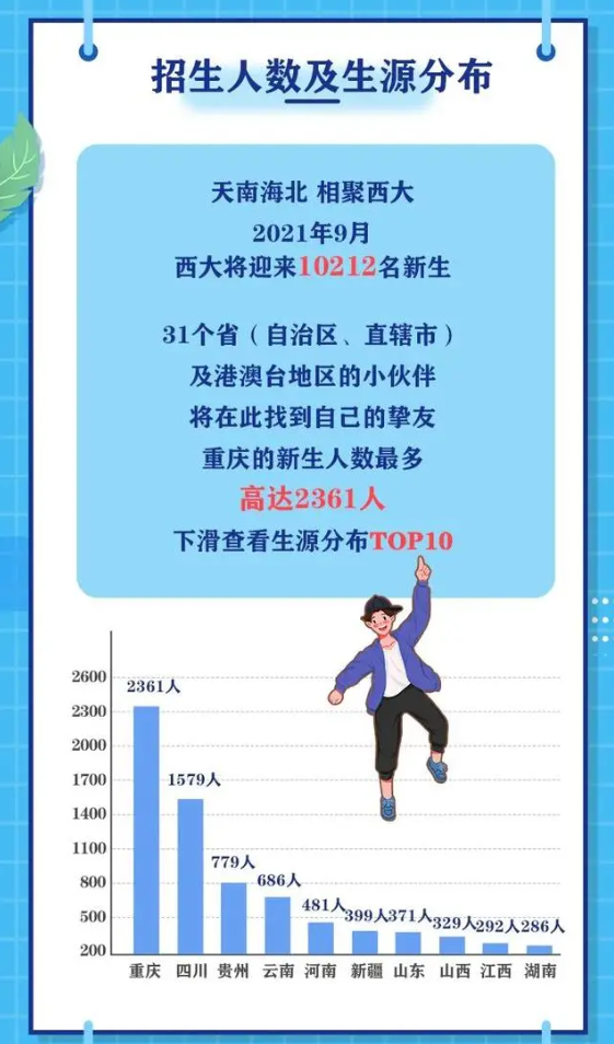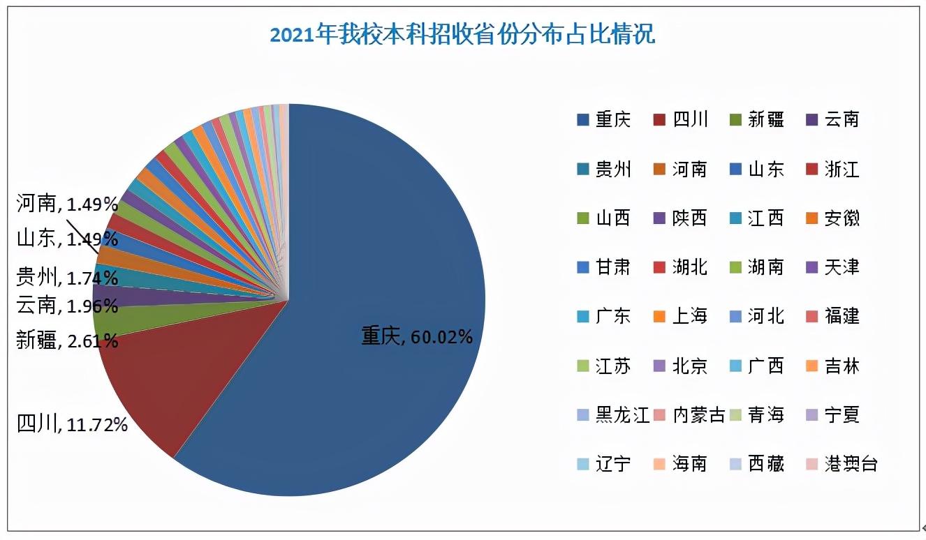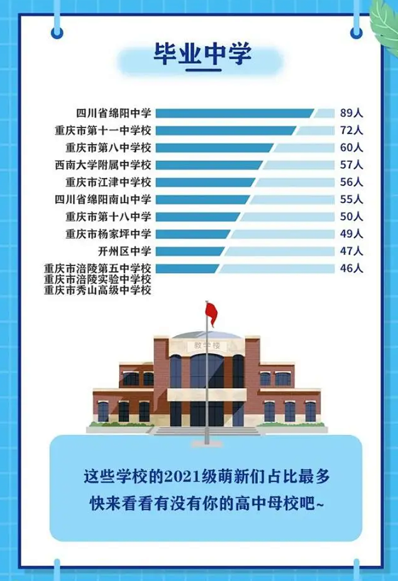 这里整理收集了重庆西南大学、重庆医科大学,重庆西南政法大学,重庆邮电大学、重庆理工大学2021级本科新生大数据,重庆高校的新生中哪所高中占比最高?大家最关注各学院的男女占比?快来看看你最关心的数据吧!