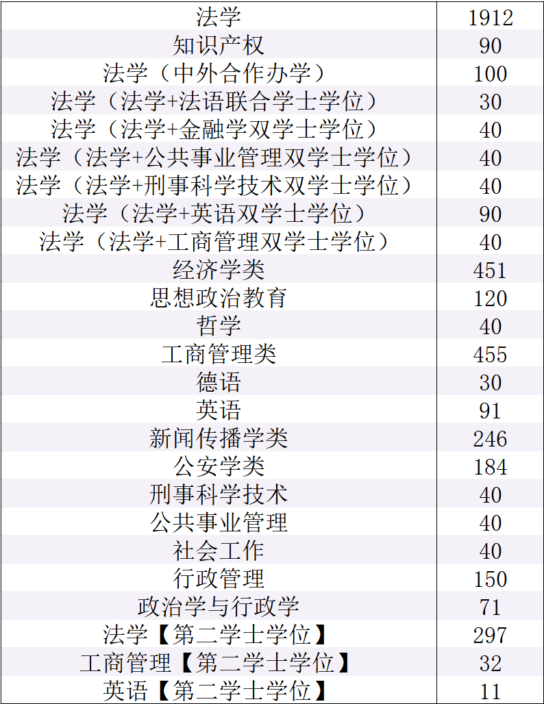 今年西政的新生专业录取数据依然彰显出西政专业特色,根据2021级西政新生专业录取数据,法学专业录取人数最多为1912人,其次为工商管理类455人、经济学类451人。