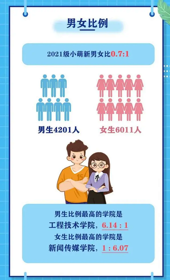 今年本科新生中有男生1569人、女生2458人,男女比为0.64:1,今年女生要多一些。