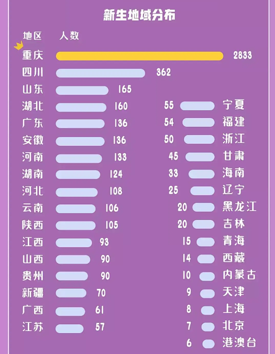 在主要生源中学中,统计了重庆市生源中学前20名,四川省生源前5名,以及其他省生源学校第1名(3人以上)。可以看出,重庆主要生源前三位分别为:重庆市第八中学校59人、重庆市石柱中学校59人、重庆市涪陵实验中学校57人。