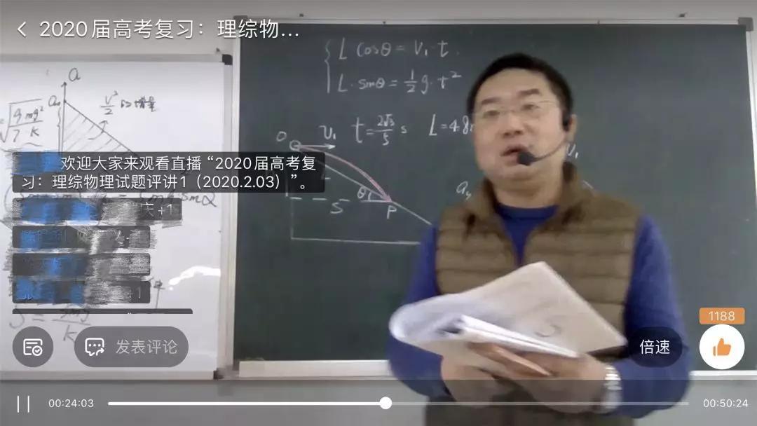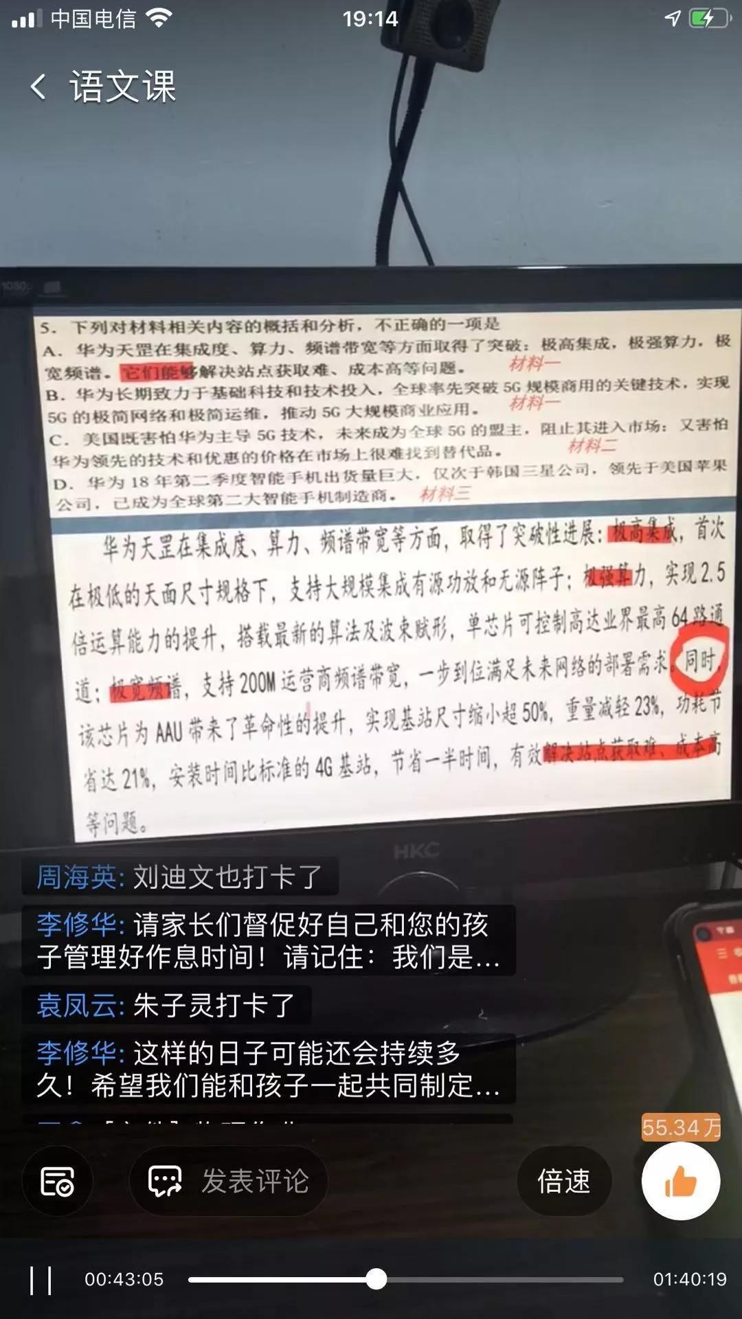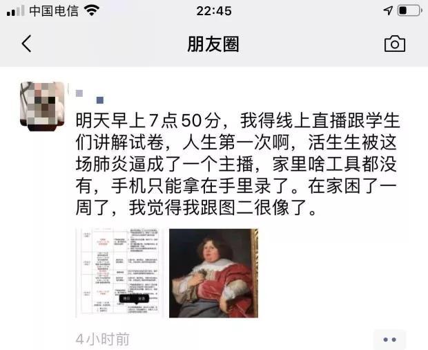 有的老师没有架子,就拿着手机对着卷子或者电脑讲课。有一个老师回老家武汉天门市的一个贫困山区,就用自己的手机流量完成线上教学。有一个生物老师因为手边只有一部手机,每个他用手抄题到凌晨,白天再拿手机做解题直播。