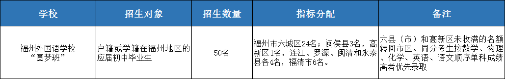圆梦班(自主招生方式)共招收50人,内含市区招收24人,间侯县招收3人,高新区招1人,间清、永泰、连江、罗源各招收4人,福清市招收6人。六县(市)和高新区未收满的名额转回市区。同分考生按数学、物理、化学、英语、语文顺序,单科成绩高者优先录取。