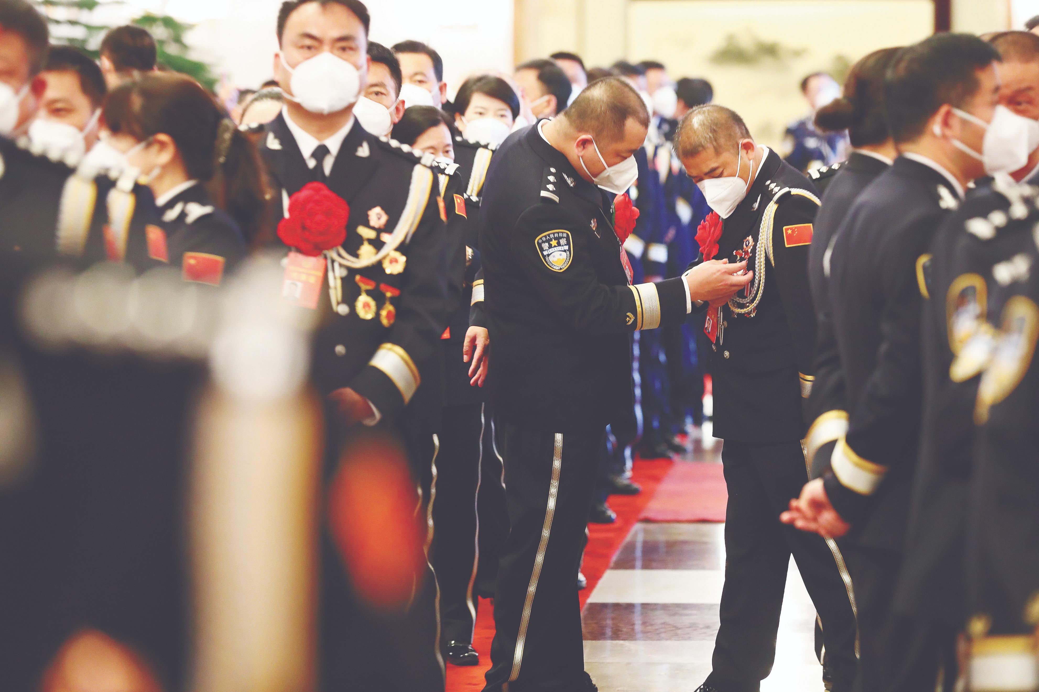 人民大会堂灿若繁星的灯光下,身着警礼服、胸前缀满勋章的全国公安系统英雄模范和立功集体代表激动不已,接受党和人民给予的最高荣誉和褒奖。