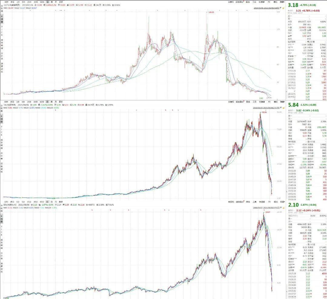 截至我们发稿(8月9日),新东方股价从最高点19.97美元跌至2.10美元;高途集团从最高点149.05美元跌至3.18美元;好未来从最高点90.96美元跌至5.84美元,蒸发约88%-97%不等,断崖下跌惨烈程度可见一斑。