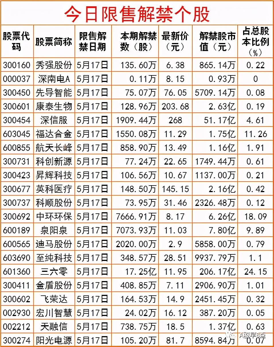 数据显示,本周(5月17日—5月21日)共有59家公司限售股陆续解禁,合计解禁量57.9亿股,按5月14日收盘价计算,解禁市值为837.52亿元。从解禁市值来看,解禁市值居前三位的是:三六零(228.25亿元)、深信服(127.93亿元)、金博股份(69.55亿元)。从解禁占比来看,解禁占比居前三位的是:恒林股份(71.25%)、金博股份(56.13%)、晶科科技(41.46%)。