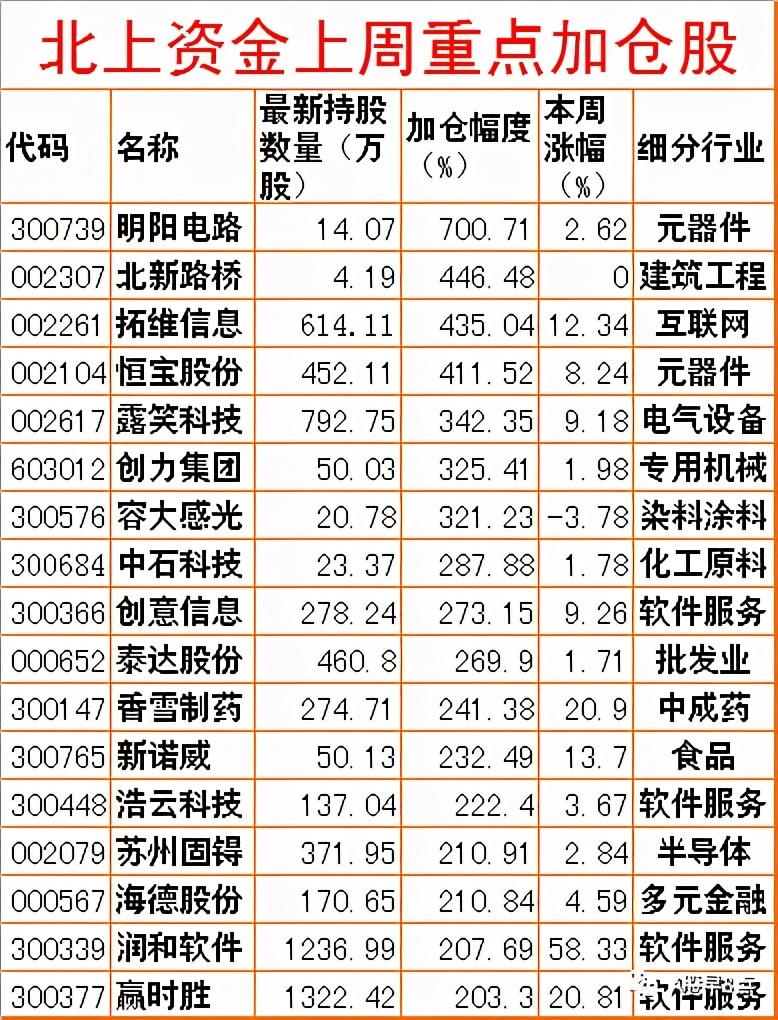 上周北上资金加仓股共863只,以持股数量增长幅度来看,加仓幅度超50%的股票有80只,超100%的股票有36只。