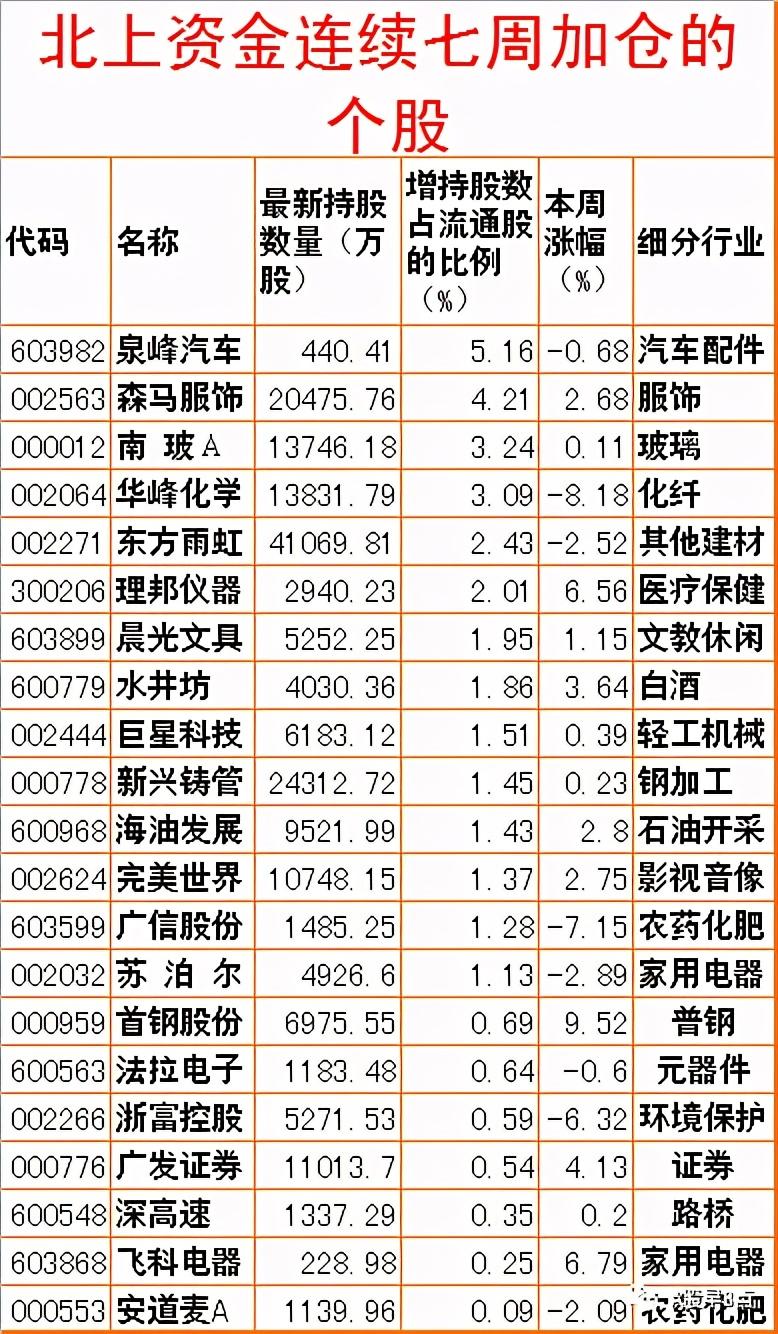 北上资金连续4周买入101股,分行业来看,化工行业个股较多,有14只。其中,21股被北上资金连续7周加仓。