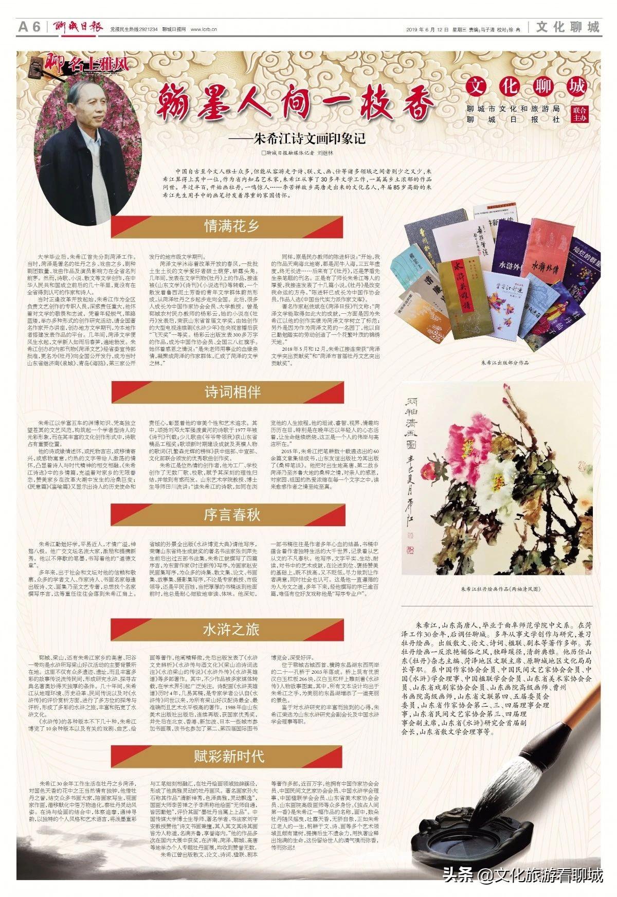 朱希江曾出版散文、论文、诗词、楹联、剧本等著作多部,近百万字,他拥有中国作家协会会员、中国民间文艺家协会会员、中国水浒学会理事、中国楹联学会会员、山东省美术家协会会员、山东画院高级画师等众多身份。他在聊城地区文化局局长的岗位上退休,独占人间第一香是他一幅牡丹作品的名称,画中,数朵牡丹随风摇曳,吐露天香,无骄自傲,正如朱希江老人的一生,躬耕于文、诗、画等多个艺术领域且颇有建树,提携后生不遗余力,用执著诠释出饱满的生命,这份留给世人的清气嗅而弥香,传而弥远!