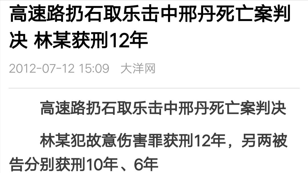 不久,官方侦破此案,真相却是谁也没有想到的。邢丹车辆所经的惠东稔山路段附近有一个村庄,名叫石头岭,村里有三个早早辍学的孩子,一直闲来无事,喜欢对着过往车辆的玻璃扔石子,从中获得乐趣。
