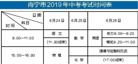 中考方面,全市报名参加中考的总人数为85946人,全市中考设15个考区,有南宁市二中新民校区、兴宁区一中、江南中学、吴圩镇中学等161个考点共2941个考场。全市中考时间为6月24、25、26日。