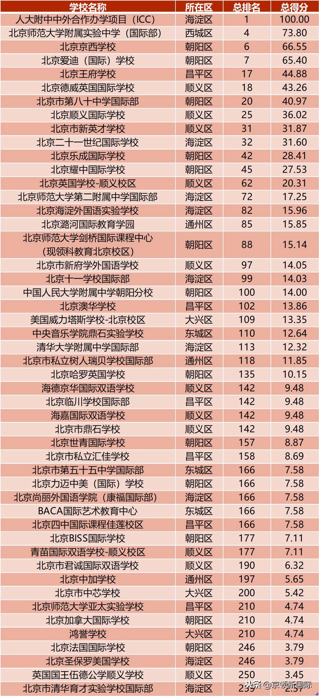 海淀区的人大附中中外合作办学项目(ICC)升学竞争力得分为全市最高,为37.26分;西城区北京师范大学附属实验中学(国际部)升学竞争力位列全市第二,得分为31.15;在朝阳区位列升学竞争力第一为北京爱迪国际学校,得分为23.6,北京京西学校位列朝阳区第二;在昌平区,顺义区,通州区,大兴区位列升学竞争力第一的分别是北京王府学校,北京市新英才学校,北京潞河国际教育学园,和美国威力塔斯学校-北京校区。