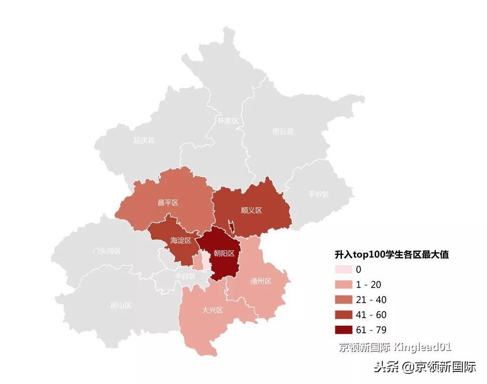 北京师范大学附属实验中学(国际部)2018年进入世界TOP10大学的学生最多,达6人。昌平区和顺义区进入世界TOP10大学的学生最多的分别为北京王府学校和北京市新英才学校,各4人;海淀区最高的为人大附中中外合作办学项目(ICC),有2人。朝阳区升入TOP10大学最多的为北京市第八十中学国际部,有2人。