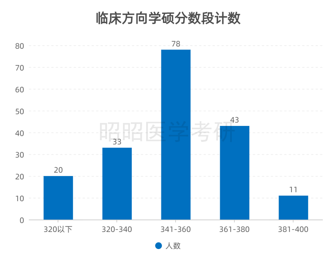临床学硕:共录取186人,除特殊政策外,最高分为396分,报考报考临床检验诊断学;最低分为309分,报考肿瘤学(肿瘤学内科相关研究)、外科学(普外相关研究)、内科学(内分泌与代谢病相关研究)专业。大部分考生分数段趋于341-360分之间。