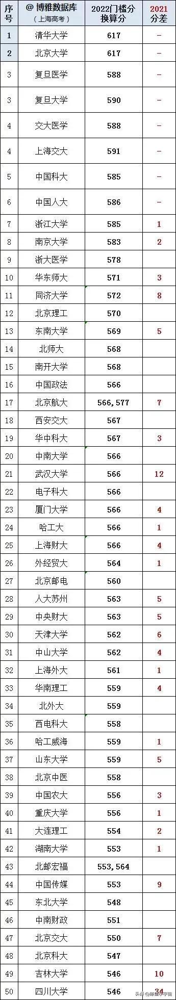 从上图可以看出,2022年全国高校在上海最低投档分前五十的高校,清华北大预估617分,同比上涨4分,2022年浙大预估最低投档分585分,同比上涨8分。还有东南大学预估569分,同比上涨7分。整体来看,普遍同比上涨8分左右。