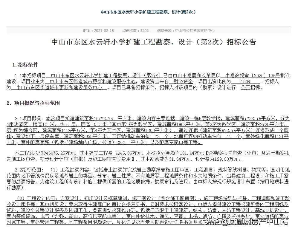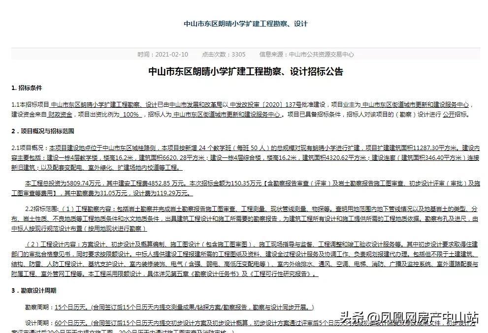 凤凰君从中山市公共资源交易中心官网获悉,东区朗晴小学、水云轩小学获批扩建,目前正公开招标。