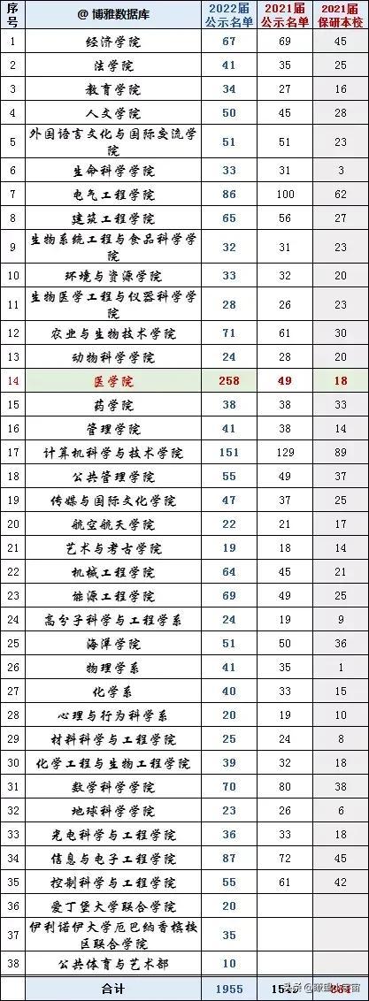 2、浙江大学2022届具有保研名额的院系有38个,其中保研最多的是浙大医学院258人,相对于复旦医学院、上交大医学院、北大医学院,浙大的稍微逊色一点,而且每年保外的比较多,今年一下增长了五倍之多!其次是浙大的计算机学院保了151人,浙大的计算机专业实力还是非常强的,处于A+级,而且杭州也是互联网之城,进一步促进浙大的计算机学科的发展!今年大部分专业都是正向增长的,只有部分专业如电气工程学院的保研名额负增长!同比减少14人!