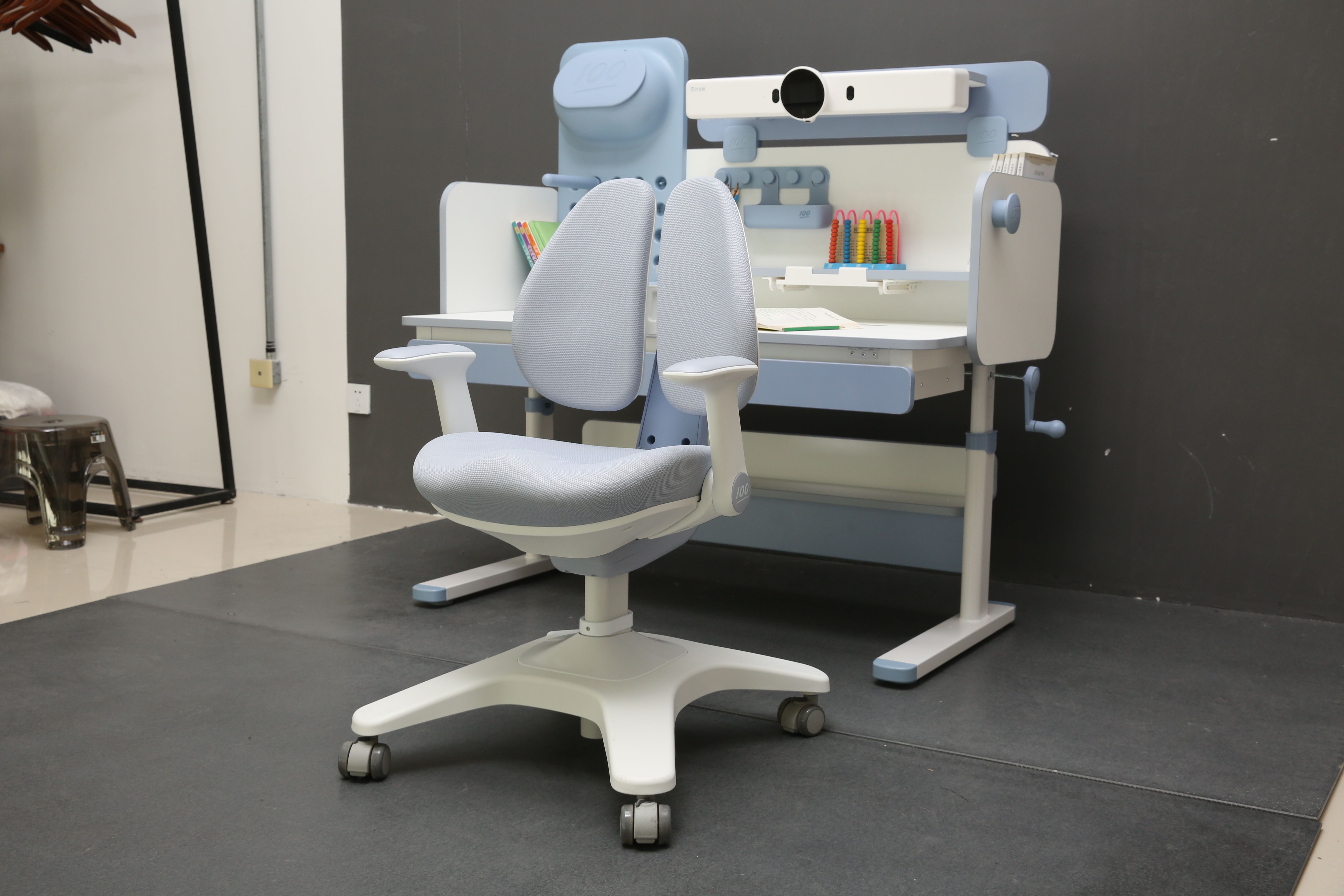 入手的这款作业帮AI学习书桌是蓝色和白色混搭,整个颜色清新自然,桌子上有显眼的作业帮logo——100分。这款学习桌长124cm、宽62cm,52-78cm范围内手摇可调节的桌子高度,配备的椅子也是可调节座椅,满足三岁及以上不同年龄段的孩子学习使用。