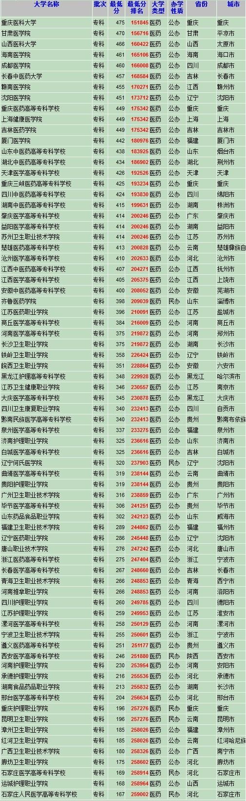 73所在川招生的医学类学校,排名第1的:重庆医科大学,2019年理科最低录取分数为:475分,位次为:151845名。