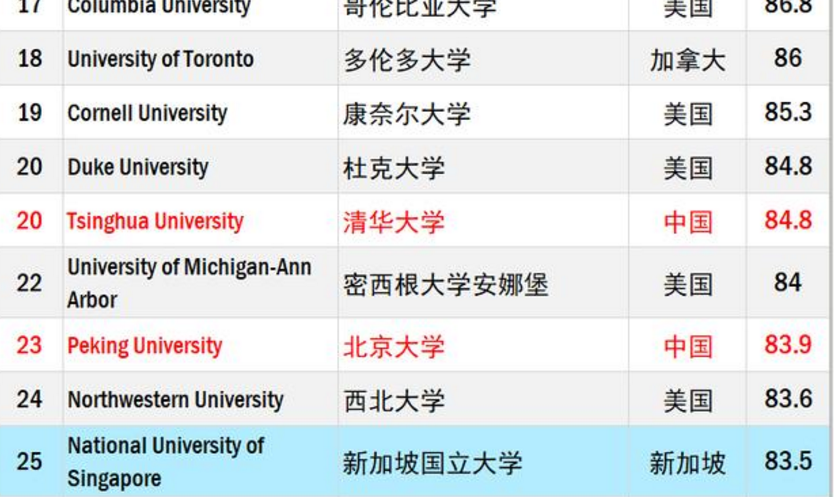 从上述榜单中,近两年的数据来看,清北有高有低,平均排名应该在25名左右,清华要比北大排名靠前,最好成绩为第9,也算是亚洲头一份了。