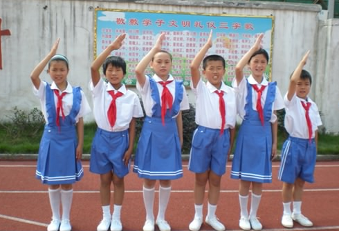 女队员:身着圆领白衬衫,天蓝色带花边背带裙,裙底同样镶有白边。佩戴上鲜艳的红领巾。