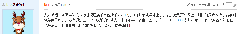 昆山论坛网友“长了翅膀的车”发帖爆料:纽约国际早教机构原址现已换了其他牌子,从12月中旬开始就没课上了,说要搬到萧林路上,到目前只听说改了名字叫兔兔熊早教,还没有通知去上课,以前的联系人,电话不接,微信不回!还剩35节课,3000多块钱呢!之前说退钱可以现在也没消息了!请相关部门帮助协调!也希望家长擦亮眼睛!