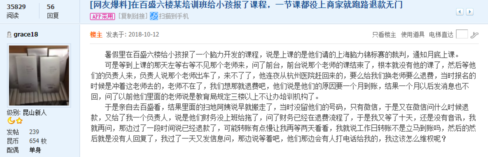 昆山论坛网友“grace18”发帖:暑假里在百盛六楼给小孩报了一个脑力开发的课程,说是上课的是他们请的上海脑力锦标赛的裁判,通知月底上课。