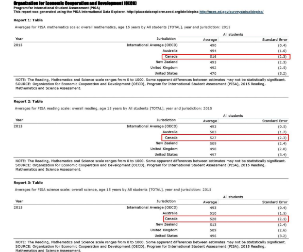 而在由OECD发起的PISA评估中,对各国年龄15岁的学生从阅读、数学、科学三方面进行评估来评价各国的教育体系。2015年的PISA评估结果显示,加拿大比美国、英国、澳洲、新西兰等留学大国评分更高,在英语系国家中排名第一。