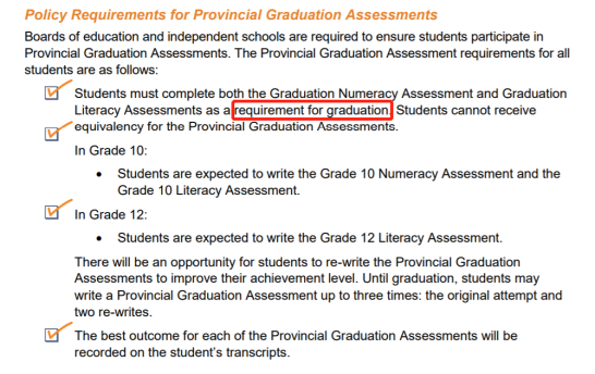 安省要求学生完成安省语言文学考试OSSLT,OSSLT难度系数也非常高,据2017年的数据显示,仅有49%的安省学生通过了OSSLT的考试。好在即使考试未通过,学生也可通过加修OSSLC课程来弥补,完成OSSLC课程的学生安省教育部视为通过OSSLT,不会影响毕业。