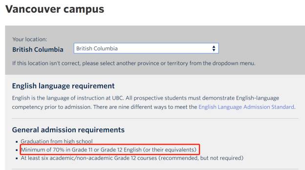 需要注意的是,很多大学对12年级英语成绩有要求,UBC、多大和滑铁卢大学要求学生English 12的最低分在70分以上,SFU则是60分以上,如果没有满足该大学要求的分数线,则无法被该大学录取。