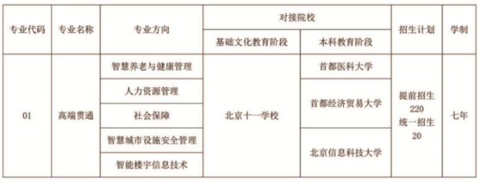 学院开展高端技术技能人才贯通培养项目,学生接受两年北京市十一学校的优质高中教育后,再进行三年职业教育,前往北京工业大学、首都经济贸易大学和首都医科大学等高校就读本科,同时学生可选择前往马来西亚新纪元大学学院、台湾树德科技大学等多所继续深造,并且可以为学生推荐到欧美、澳大利亚、加拿大等知名大学深造。