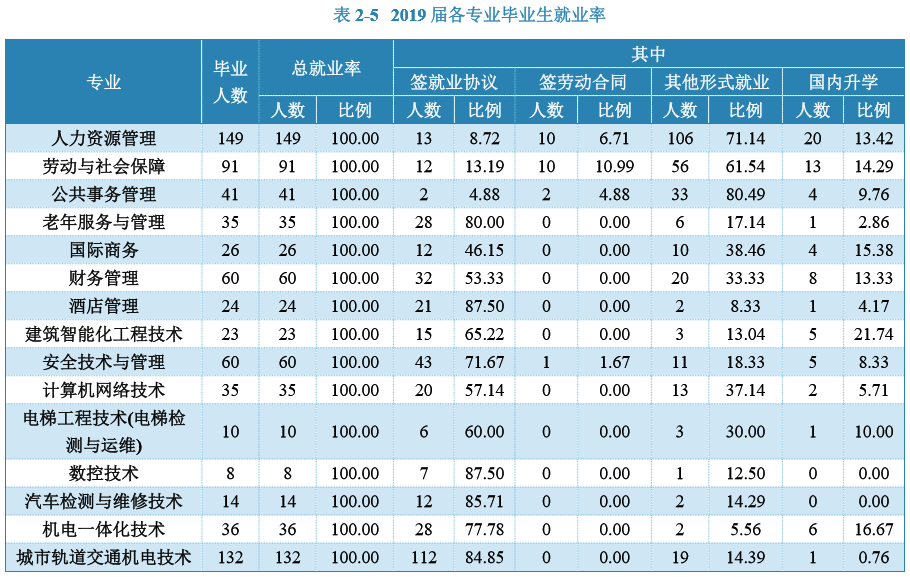 参见学院2019年质量年度报告,就业率达到100%,主要分为签就业合同、协议和单位证明,还有参军、深造和国内升学,比例如下图。