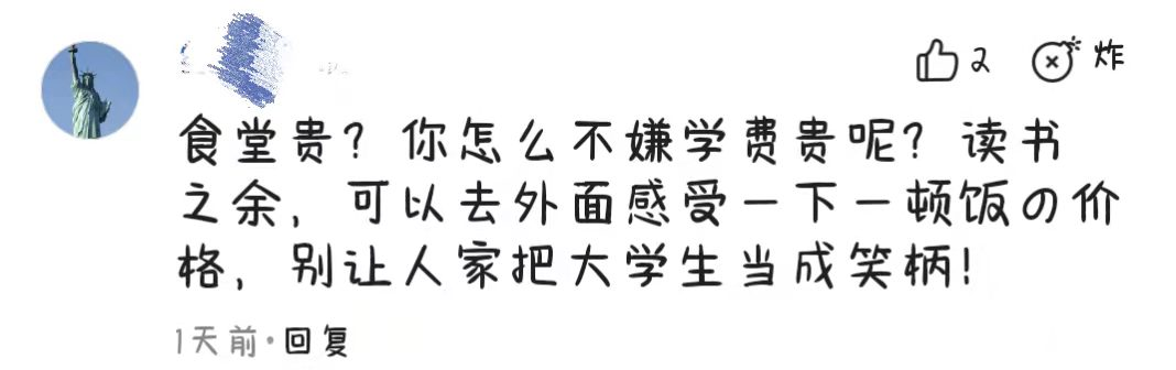 也有人支持这位学生说这两个菜确实没有那么贵,这么贵可能是一些发达城市的学校食堂吧!可是北京上海的学校食堂物价越贵,学生们就越是要努力考进当地的机关单位,就像网友所说的那样,成为自己当初渴望的样子。
