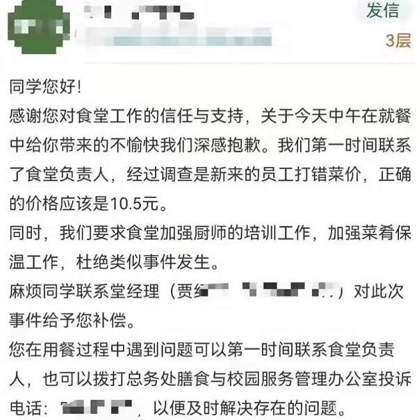 “搬起石头砸自己的脚”,贫困生吐槽校内饭菜贵,食堂回应来了,食堂回应称,其实这顿饭的价格是10.5元,新来的员工打错价格了,可以联系食堂的负责人,给予学生补偿。