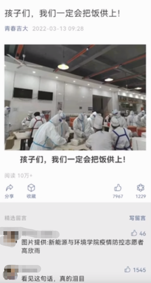 但最感人的还是因匆匆封寝而不得不加急烹饪饭菜的食堂,在忙碌之时还不忘喊话:孩子们,我们一定会把饭供上!很多学生表示一句孩子们让他差点泪目了,食堂阿姨们辛勤的背影。是他们在为我们负重前行。
