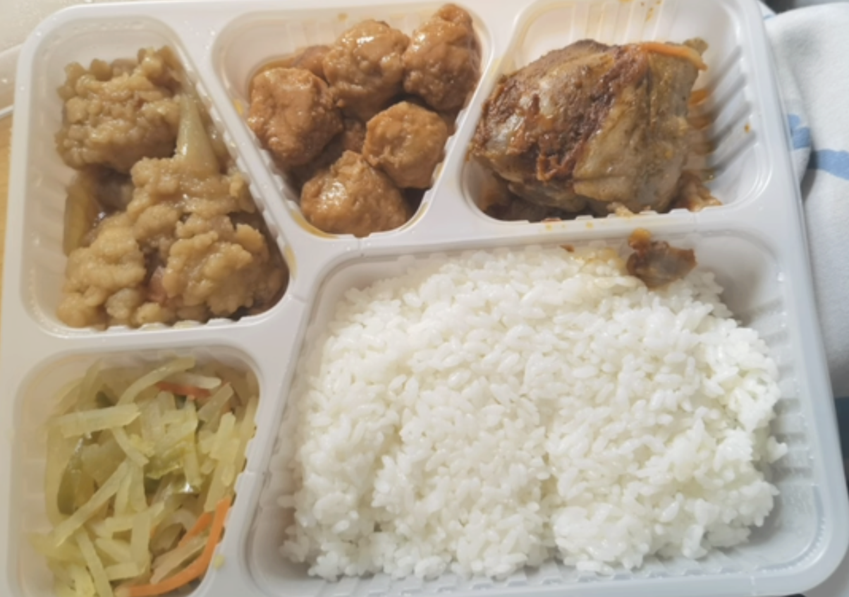 但当隔离餐发下来时,学生们感觉自己真的是多虑了,让我们看看他们分享出的盒饭,两荤两素。这个荤菜是实打实的荤菜,不是拌着素肉的荤菜。且和米饭一样,每样食物的分量都很惊人。