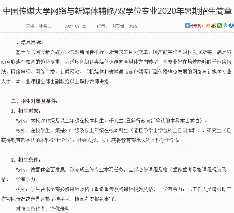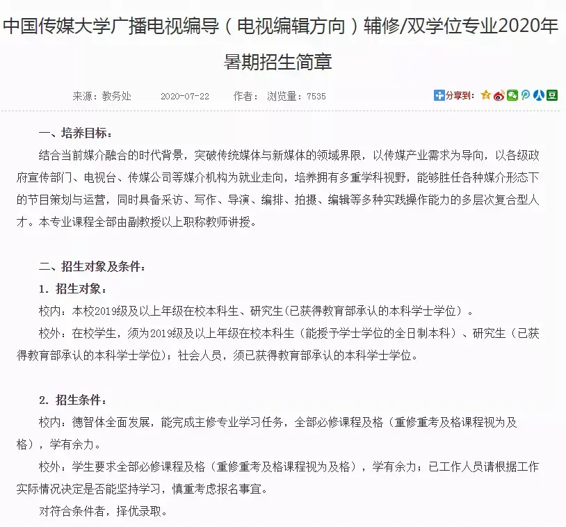 专业:广播电视编导(电视编辑方向)、网络与新媒体招生对象:本校在读本科生,研究生;以及外校生。除了双学位,还有提供辅修专业,详细内容可以根据自身实际情况咨询学校教务处。