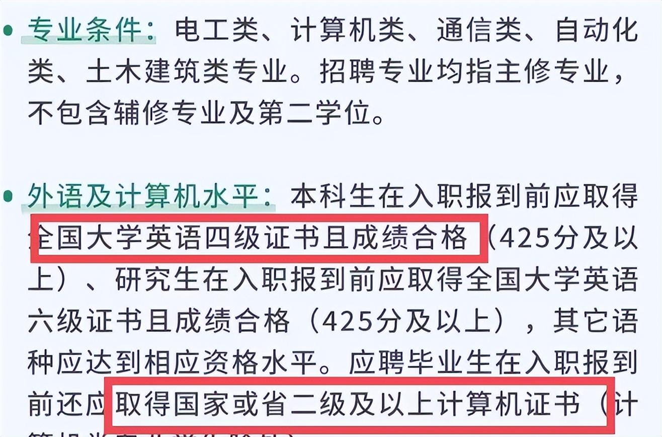至于计算机二级证书,这个比较少见,以往基本上没有要求这类证书的,也是大众公认的最没用的证书。但这次居然要求了,因此对于有计算机二级证书的毕业生算是捡到宝了。