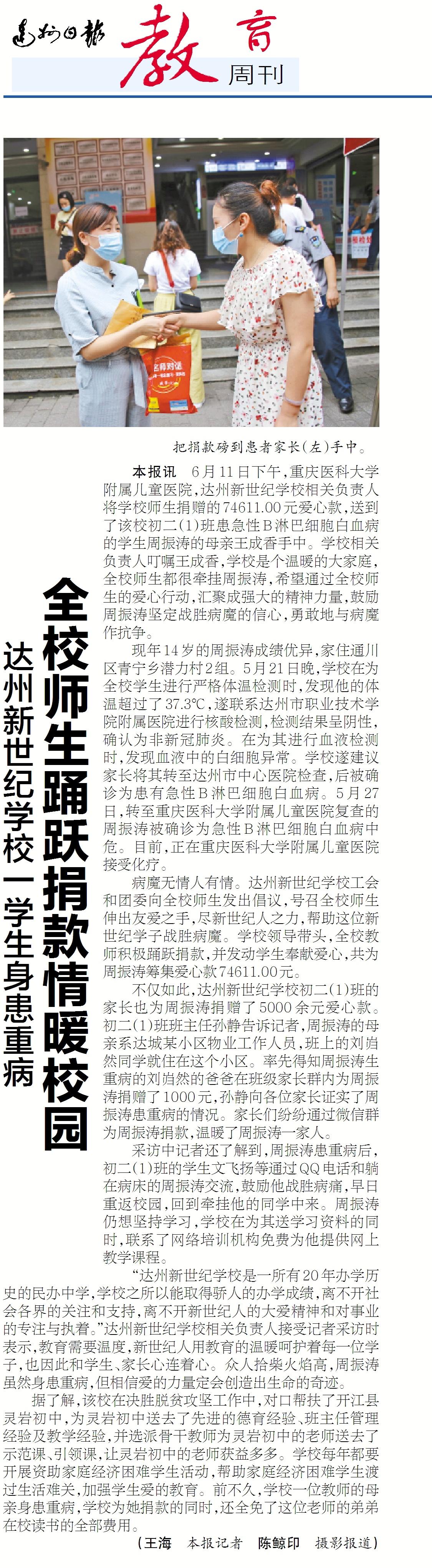 本报讯 6月11日下午,重庆医科大学附属儿童医院,达州新世纪学校相关负责人将学校师生捐赠的74611.00元爱心款,送到了该校初二(1)班患急性B淋巴细胞白血病的学生周振涛的母亲王成香手中。学校相关负责人叮嘱王成香,学校是个温暖的大家庭,全校师生都很牵挂周振涛,希望通过全校师生的爱心行动,汇聚成强大的精神力量,鼓励周振涛坚定战胜病魔的信心,勇敢地与病魔作抗争。