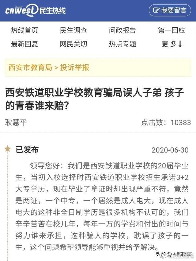 比如,2020年6月30日,一位名为耿慧平的网友,曾通过西部网《民生热线》向西安市教育局反映,西铁职校发的毕业证存在问题。
