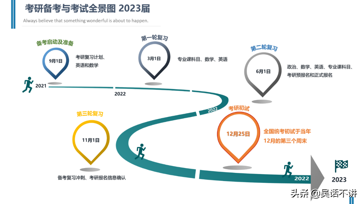 同样,你考研备考开始是在大三还是大四,这并不重要,只是提早一点可能更好,但也不一定。你一定需要提前预览备考的全程,然后合理规划出全程的几个分段,并用适当的时间节点标注出每一个阶段。你有了规划就要开始行动,你要做的就是坚持做到在备考的每一段“完赛”。这样,你就自然水到渠成,完胜在考研的终点。
